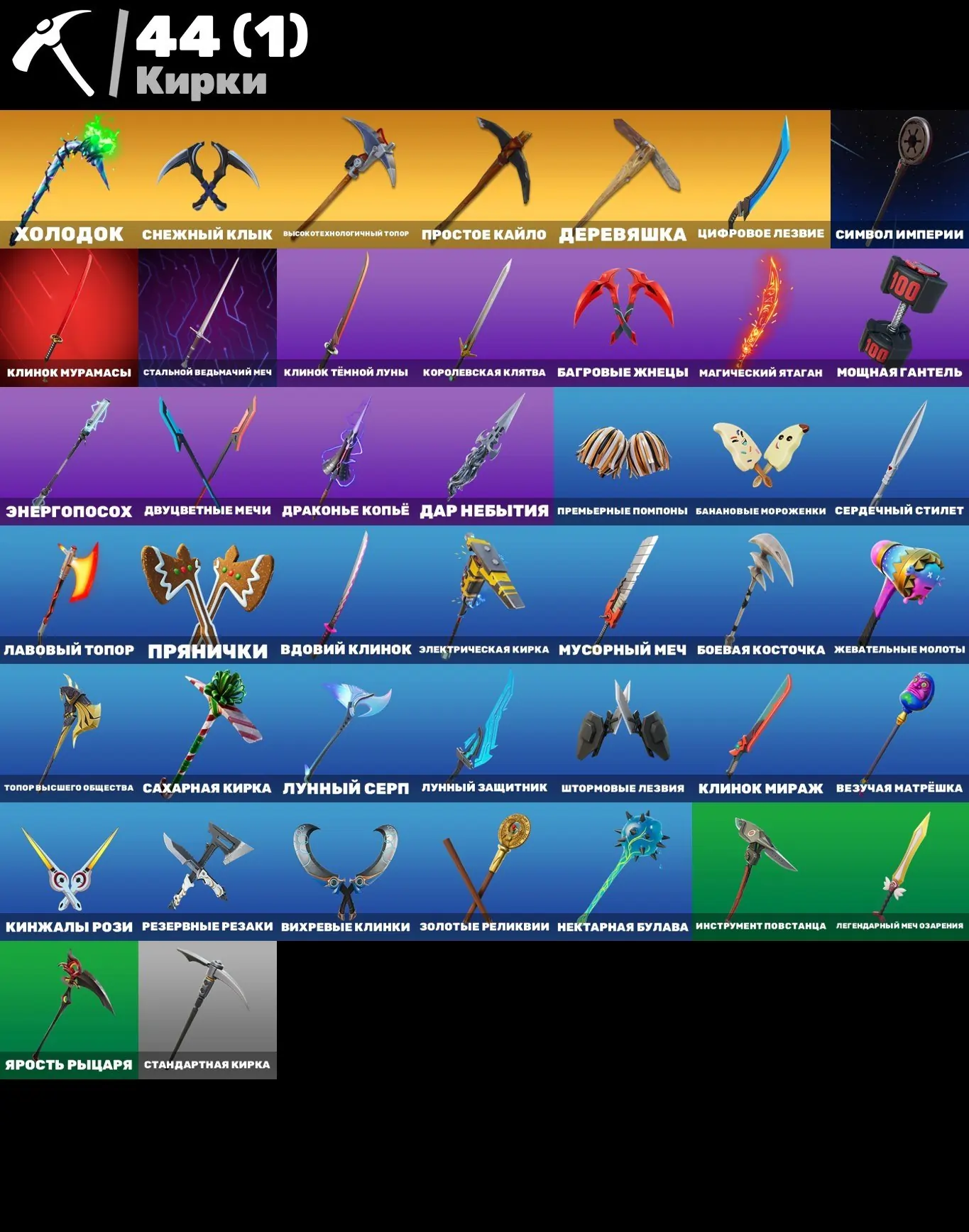 - Loaded with 44 Pickaxes, 26 Emotes, and 46 Gliders