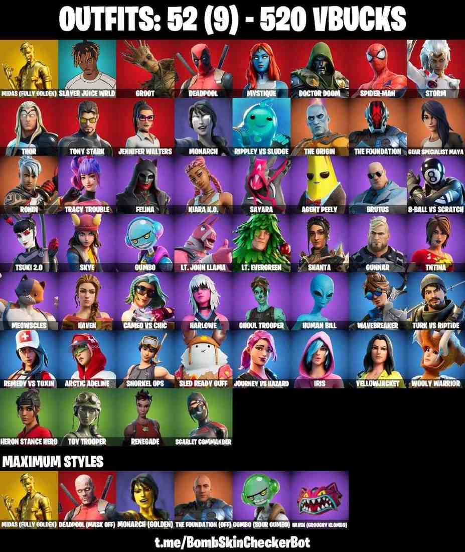 Grab this loaded Fortnite account with 52 skins including Ghoul Trooper, Tracy Trouble, Spider-Man, Golden Midas, Human Bill, Agent Peely, Maya, Tsuki 2.0, and Skye. Includes 520 V-Bucks and is playable across all platforms — PC, PSN, Xbox, Nintendo & Mobile!