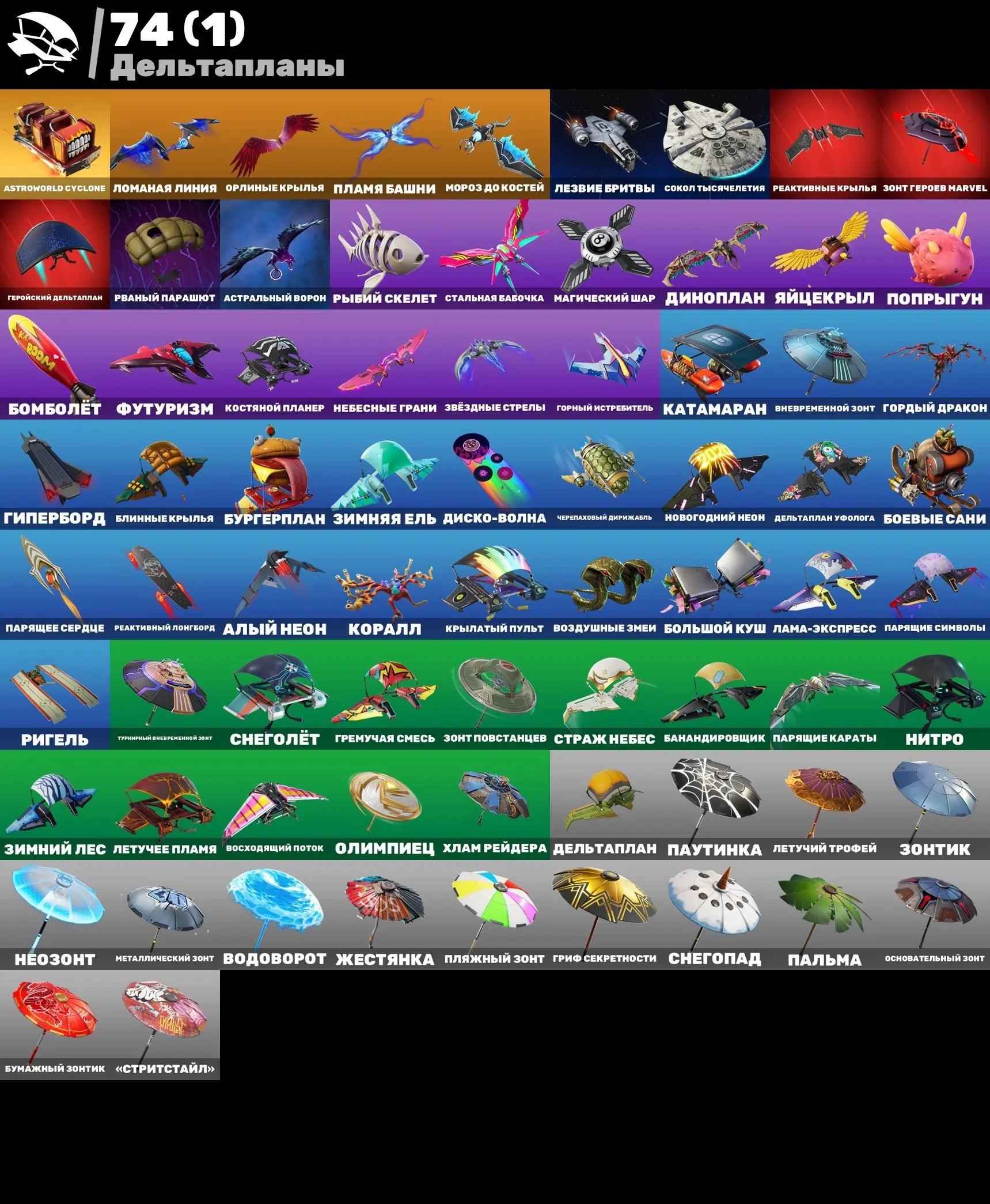 - Loaded with 74 Pickaxes, 67 Emotes, and 74 Gliders