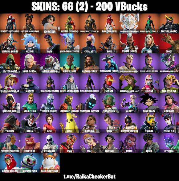 - 🦋 66 Skins – Including Peely, Goku Black, Antonia, Eternal Knight, Mystica, Y0ND3R, Overtaker