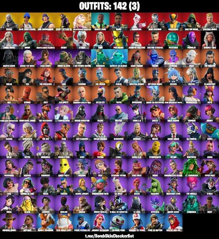 - 👕 Skins: 142 (Includes Lara Croft, Havoc, and many rare cosmetics)