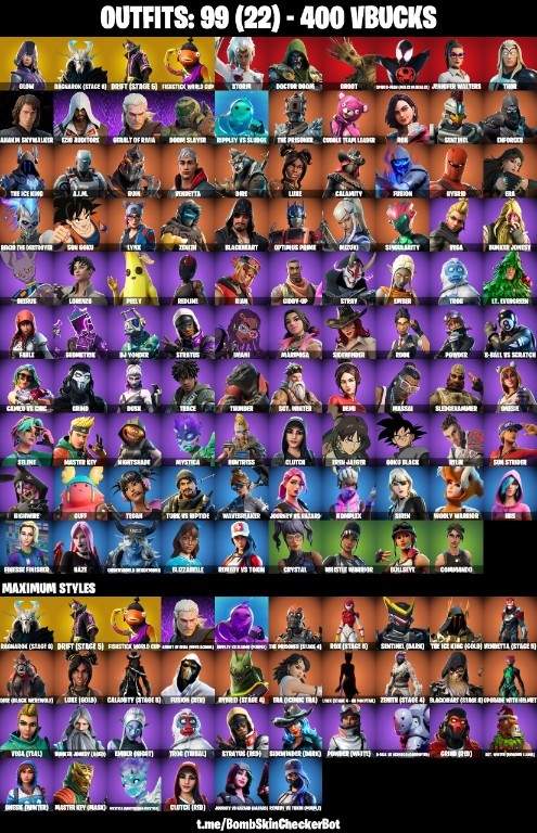 – 99 Total Skins (more rare/epic outfits)