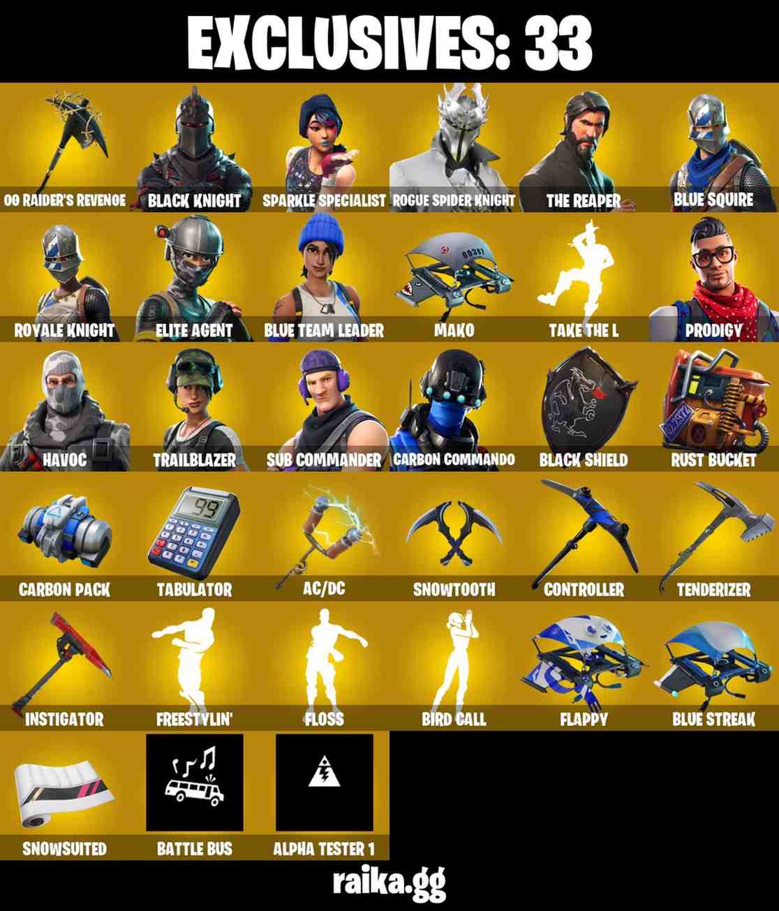 This is a premium OG Fortnite account stacked with some of the **rarest cosmetics in the game**. Featuring the legendary Alpha Tester 1 Banner, OG Raider’s Revenge, Black Knight, AC/DC Pickaxe, and emotes like Floss and Take The L — this is a collector’s dream.