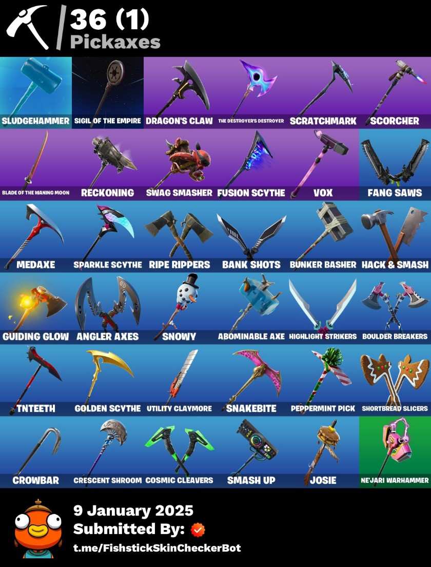 - 🪓 Pickaxes: 37 total including Reckoning, Dragon’s Claw, Fusion Scythe, Sigil of the Empire