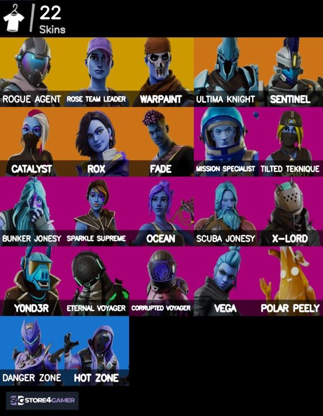 - 🌟 Main Skins: Rogue Agent, Rose Team Leader, Warpaint, Ultima Knight, Catalyst, Rox, Fade, Vega