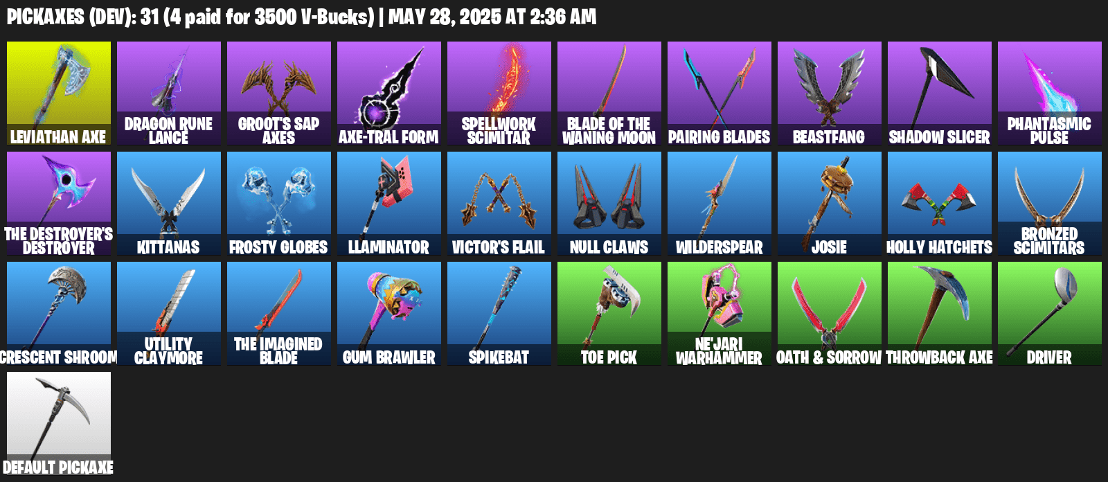 ✅ Pickaxes: Leviathan Axe, Dragon Rune Lance, Blade of the Waning Moon, Groot’s Sap Axes, Beastfang, Spellwork Scimitar, Kittanas, Phantasmic Pulse, Victor’s Flail, Frosty Globes, Llaminator, Josie, Wilderspear, and more