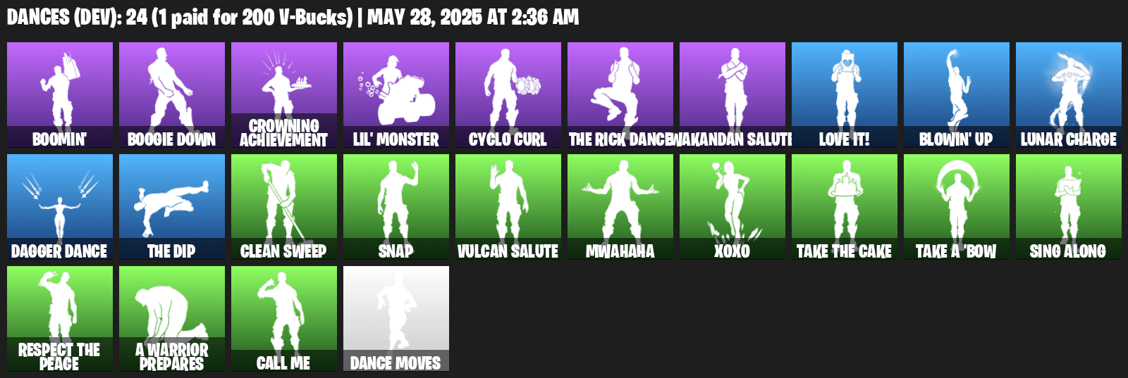✅ Emotes: Boomin’, Lil’ Monster, Crowning Achievement, Wakandan Salute, Boogie Down, Mwahaha, Lunar Charge, Take a ‘bow, Sing Along