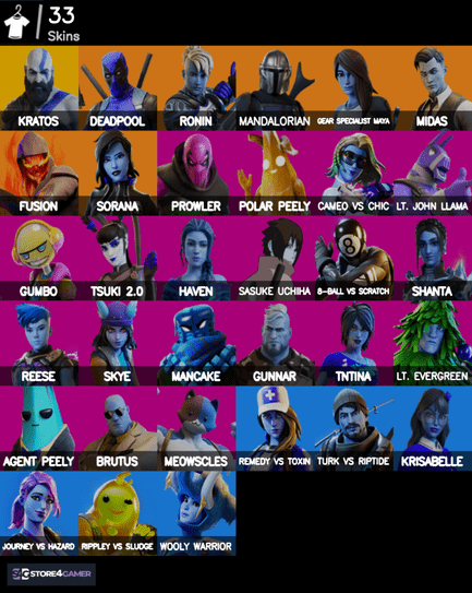 ✅ Popular Skins: Kratos, Deadpool, Mandalorian, Ronin, Midas, Fusion, Gear Specialist Maya, Sorana, Prowler, Polar Peely, Sasuke Uchiha