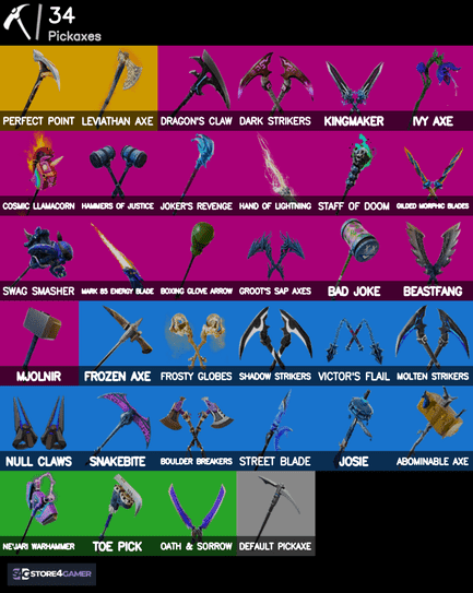✅ Pickaxes: Leviathan Axe, Dark Strikers, Dragon’s Claw, Mjolnir, Groot’s Sap Axes, Perfect Point, Boxing Glove Arrow, Kingmaker, Beastfang, Joker’s Revenge, Bad Joke, Swag Smasher, and more