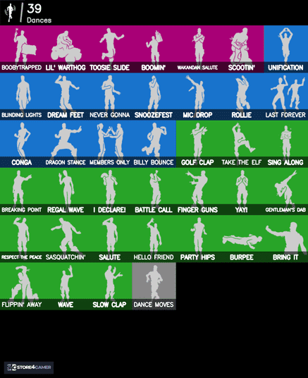 ✅ Emotes: Boobytrapped, Lil’ Warthog, Blinding Lights, Wakandan Salute, Boomin’, Scootin’, Never Gonna, Toosie Slide, Dream Feet, Billy Bounce, Take The Elf