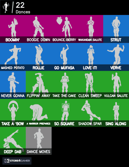 ✅ Emotes: Boomin’, Boogie Down, Wakandan Salute, Rollie, Go Mufasa, Never Gonna, A Warrior Prepares, Flippin’ Away, Strut, Verve, Clean Sweep, Mashed Potato, Love it!, Bounce Berry