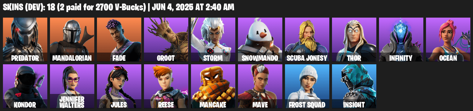 ✅ Skins: Predator, Mandalorian, Thor, Groot, Storm, Fade, Infinity, Snowmando, Ocean, Scuba Jonesy, Jules, Mancake, Mave, Kondor, Jennifer Walters, Reese, Frost Squad, Insight