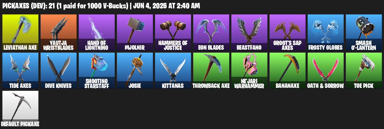 ✅ Pickaxes: Leviathan Axe, Yautja Wristblades, Mjolnir, Hand of Lightning, Groot’s Sap Axes, Smash O’-Lantern, Kittanas, Bananaxe, and more