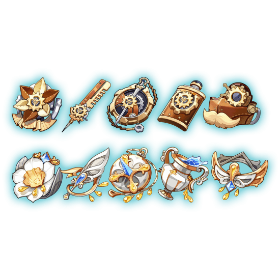 Fragment of Harmonic Whimsy, Unfinished Reverie, Wanderer’s Troupe, Vourukasha’s Glow, Viridescent Venerer, Vermillion Hereafter, Thundersoother, Thundering Fury, Tenacity of the Millelith, Song of Days Past, Shimenawa’s Reminiscence, Scroll of the Hero of Cinder City, Retracing Bolide, Pale Flame, Ocean-Hued Clam, Obsidian Codex, Nymph’s Dream, Noblesse Oblige, Nighttime Whispers in the Echoing Woods, Marechaussee Hunter, Maiden Beloved, Lavawalker, Husk of Opulent Dreams, Heart of Depth, Golden Troupe, Gladiator’s Finale, Gilded Dreams, Flower of Paradise Lost, Emblem of Severed Fate, Echoes of an Offering, Desert Pavilion Chronicle, Deepwood Memories, Crimson Witch of Flames, Bloodstained Chivalry, Blizzard Strayer, Archaic Petra, Long Night’s Oath, Finale of the Deep Galleries.
